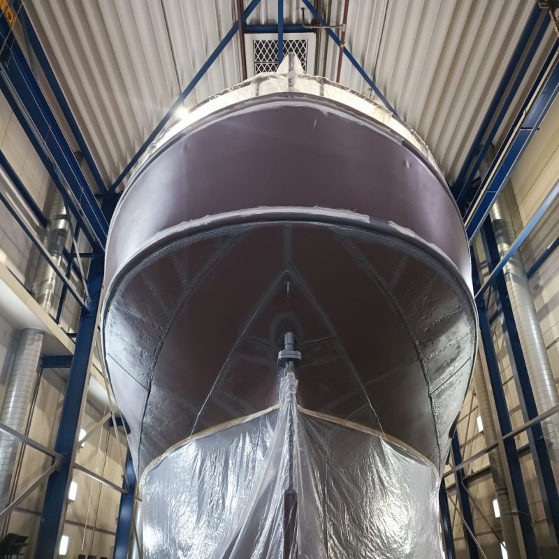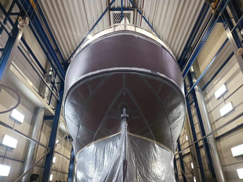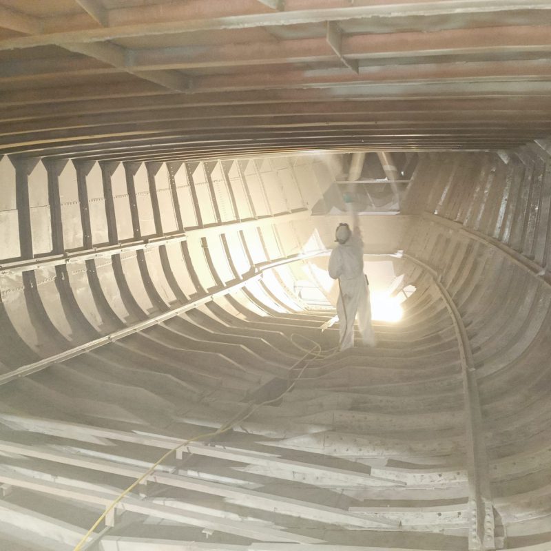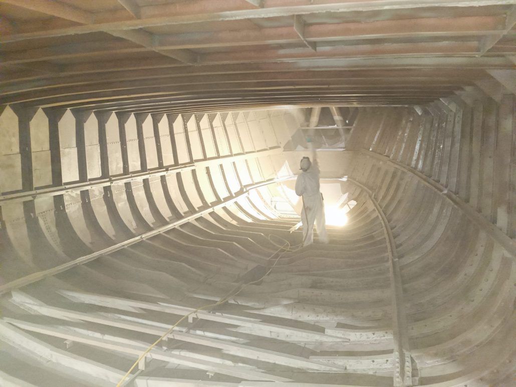 We begonnen met het stralen van de binnenzijde van de romp in twee helften tot een SA2,5 reinheidsgraad en het aanbrengen van een primer. Daarna zijn beide helften teruggebracht naar SRF voor het nodige ijzerwerk.
