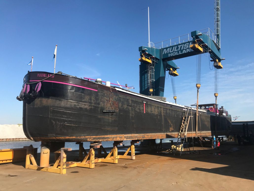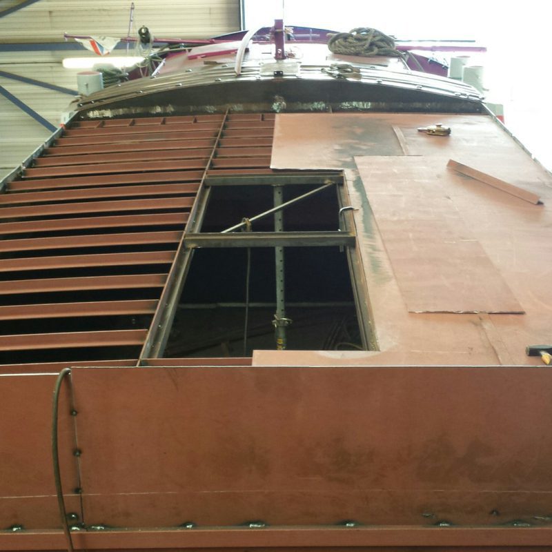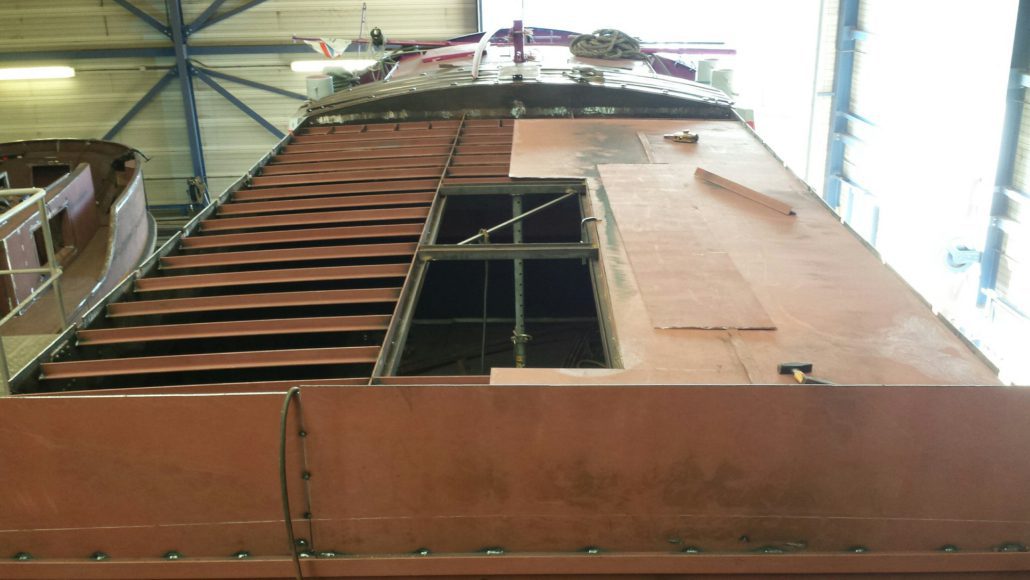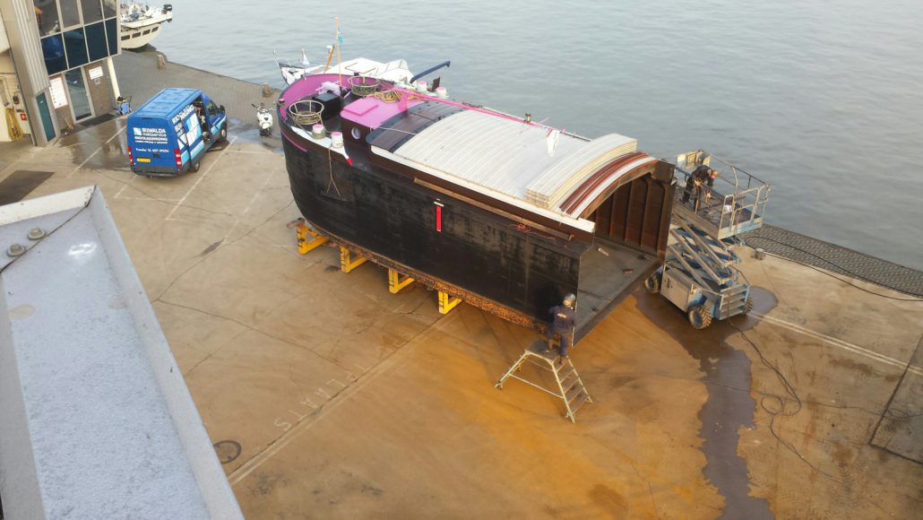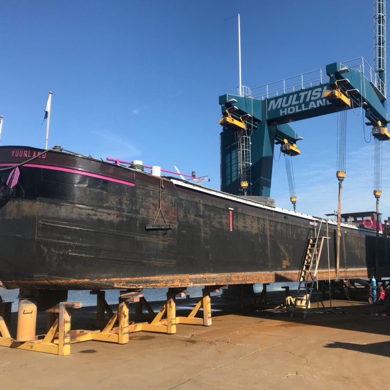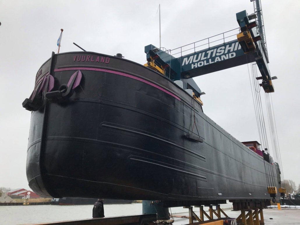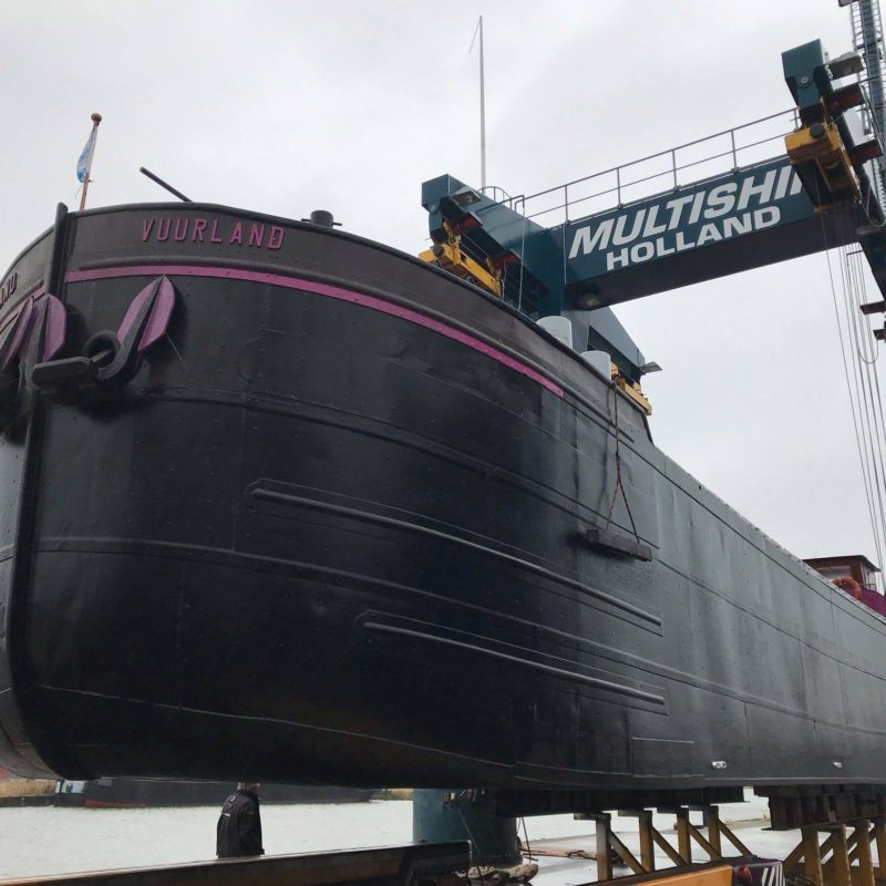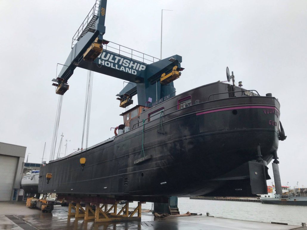 De spits “Vuurland” met een originele lengte van 39 meter is bij ons op de werf ingekort naar 30 meter, voorzien van een nieuw stalen dak ter vervanging van de aluminium luikenkap met verlaagd dakterras. De romp inclusief het onderwaterschip is na de noodzakelijke dubbelingen, gestraald en voorzien van een 3-laags Hempel verfsysteem.