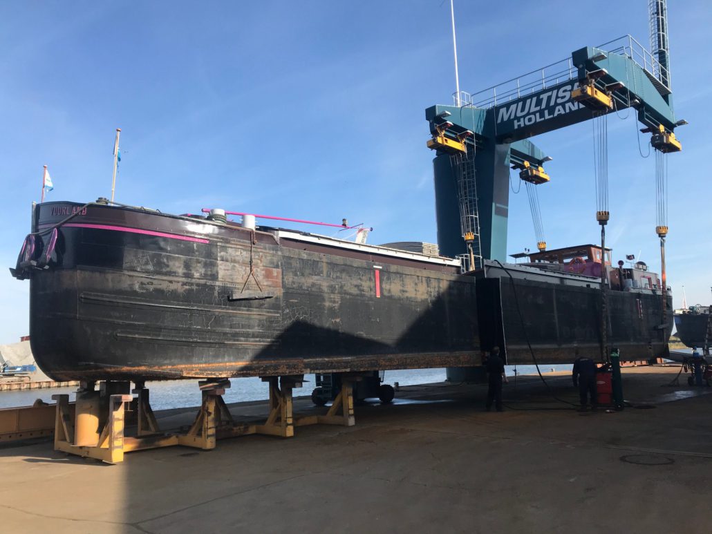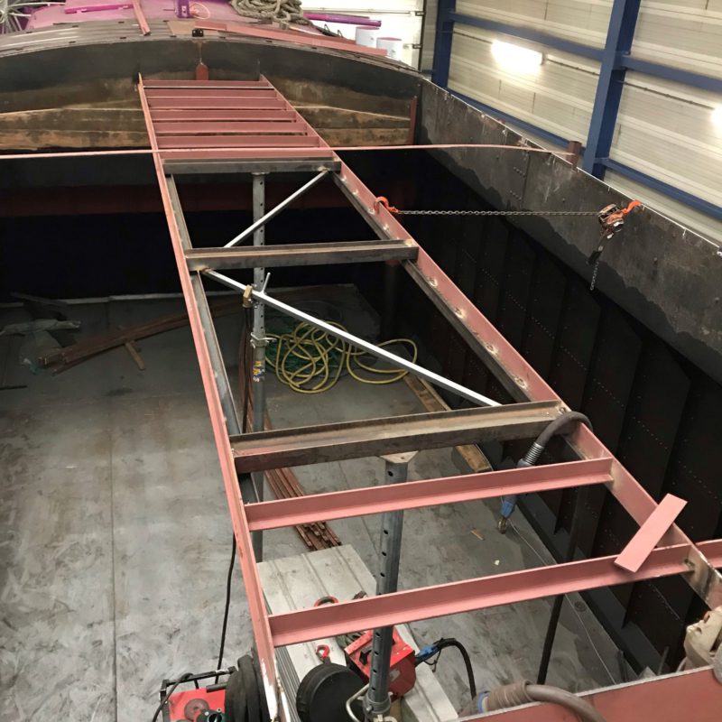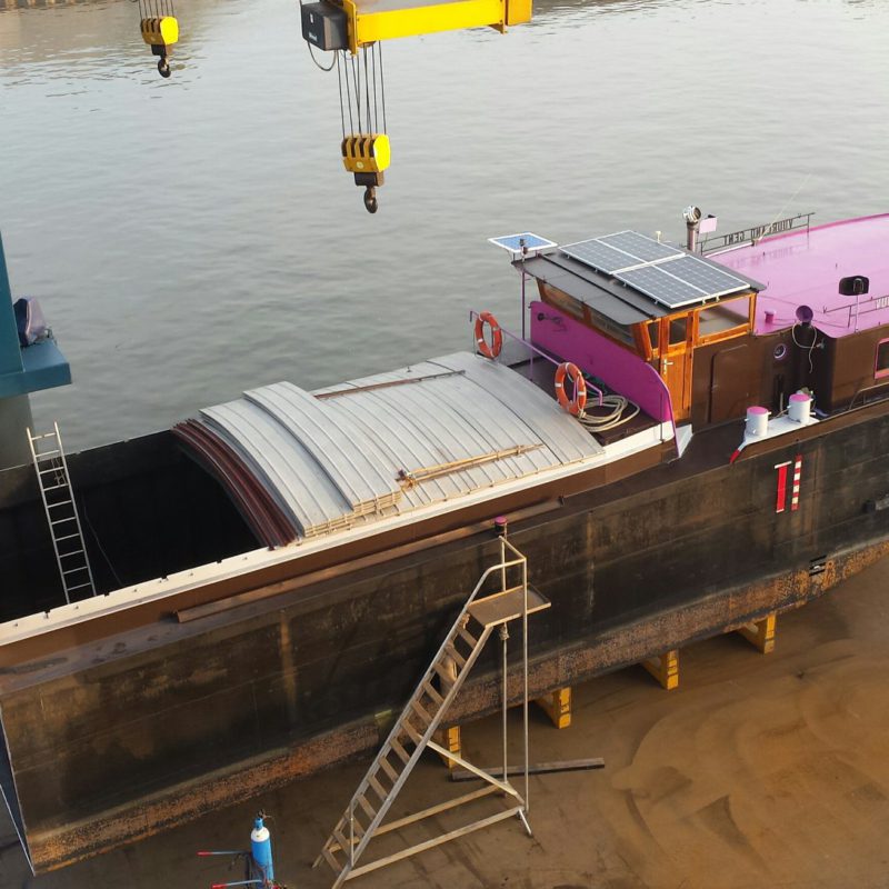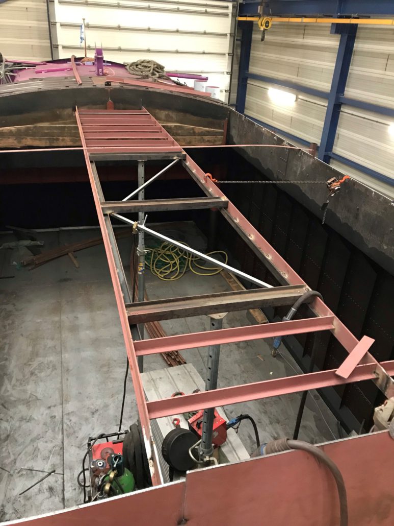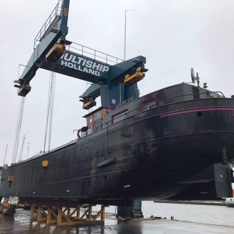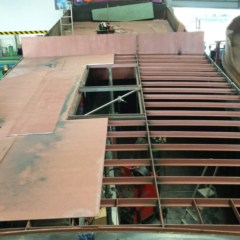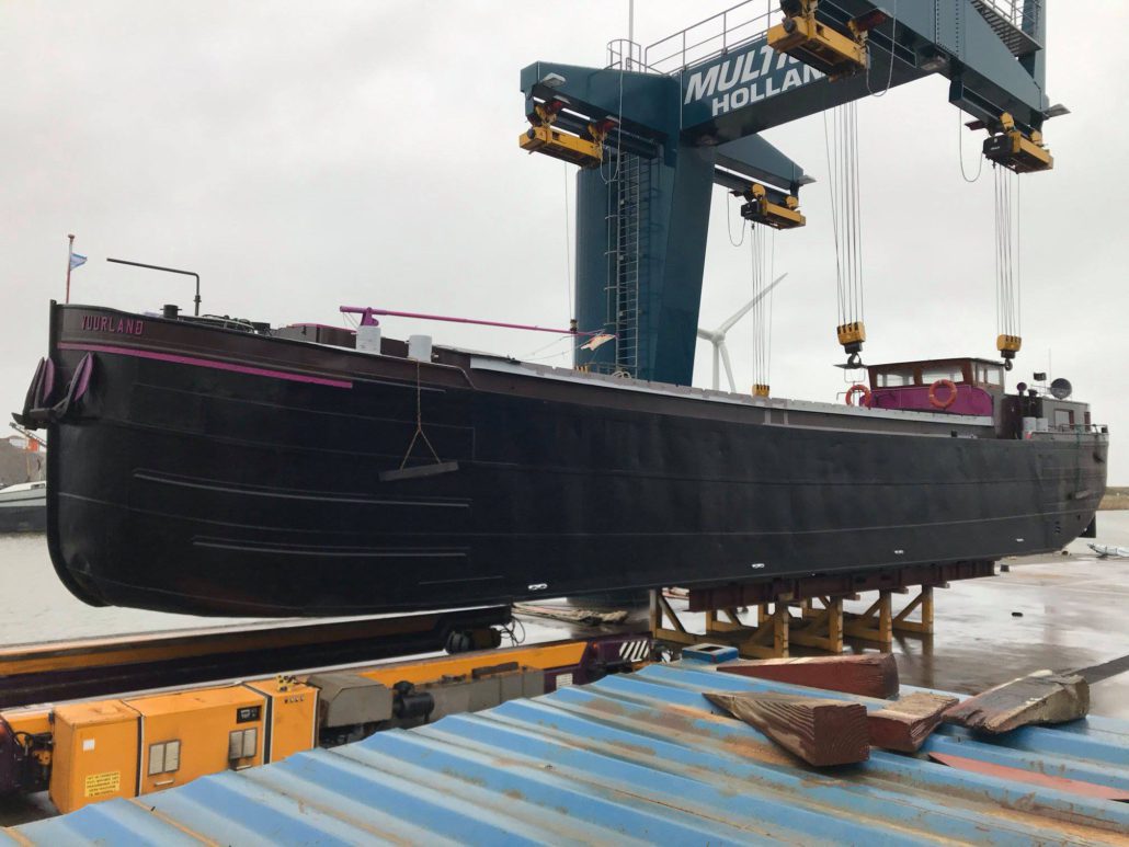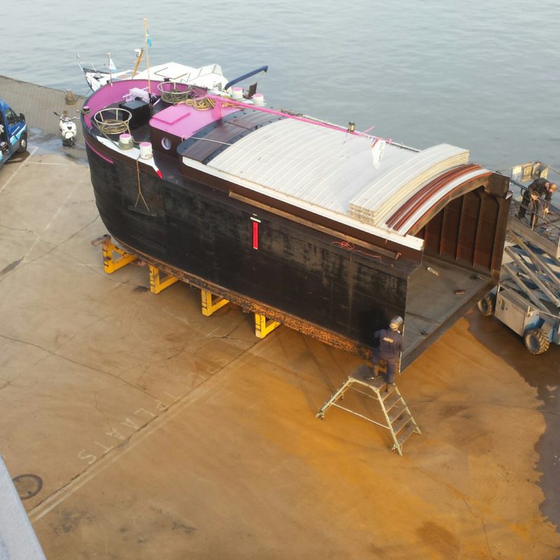 De spits “Vuurland” met een originele lengte van 39 meter is bij ons op de werf ingekort naar 30 meter, voorzien van een nieuw stalen dak ter vervanging van de aluminium luikenkap met verlaagd dakterras. De romp inclusief het onderwaterschip is na de noodzakelijke dubbelingen, gestraald en voorzien van een 3-laags Hempel verfsysteem.