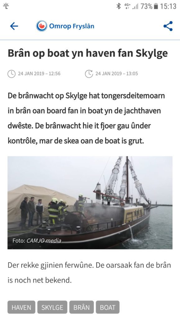 Ik begreep dat er eigenlijk geen ruimte was in de werfplanning om het schip op te nemen, maar desondanks hebben jullie gezocht naar oplossingen waardoor het schip in 8 weken tijd weer opgeleverd kon worden. De brand heeft veel verwoest. Met dank aan jullie hebben we weer een schip om trots op te zijn!