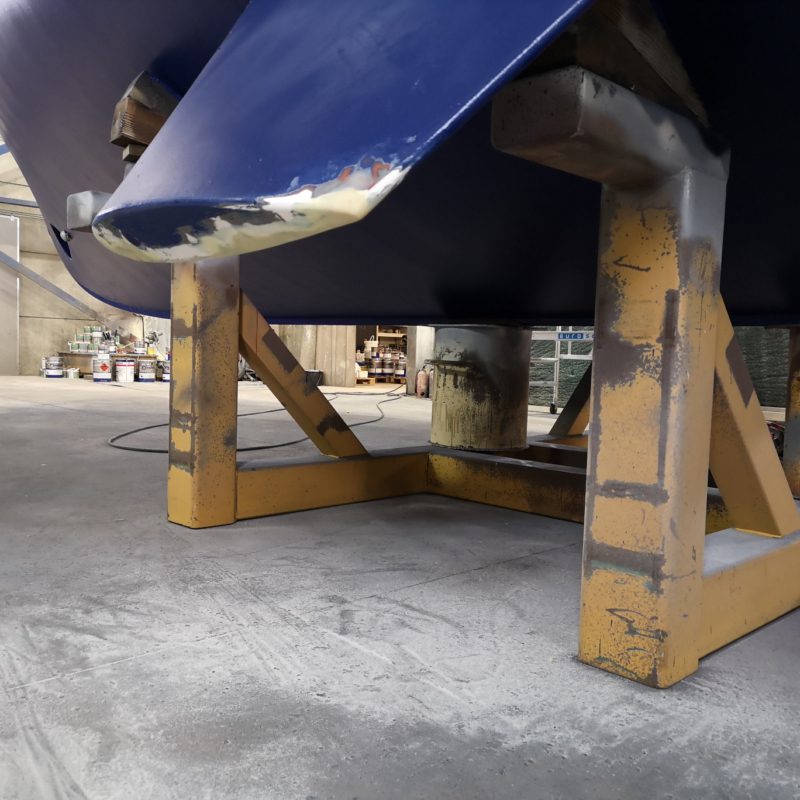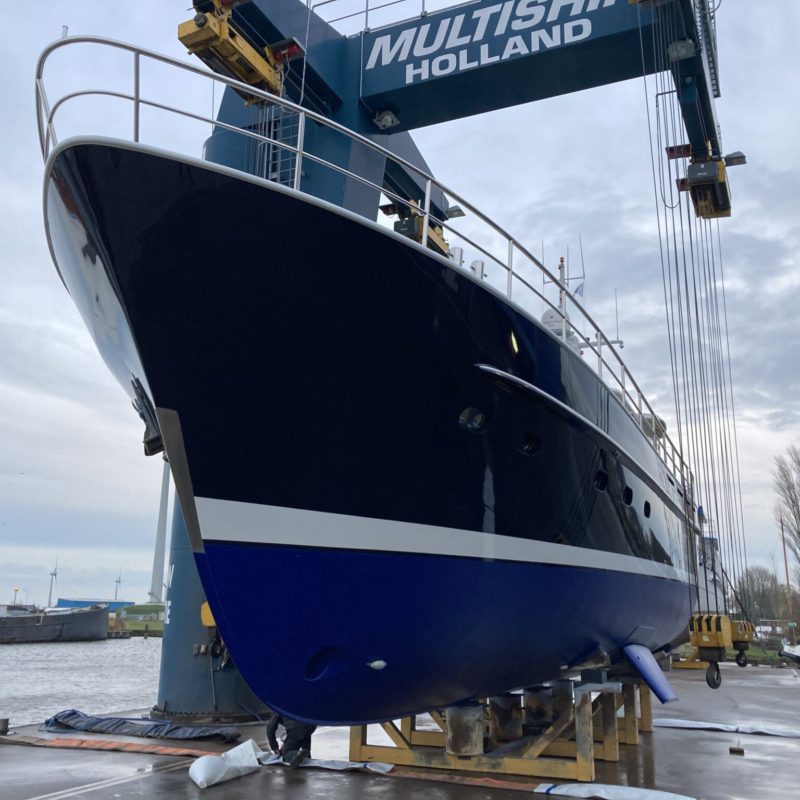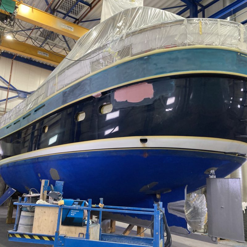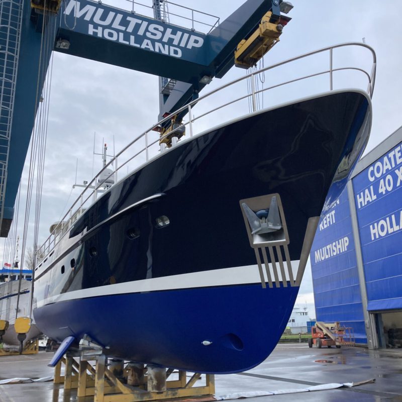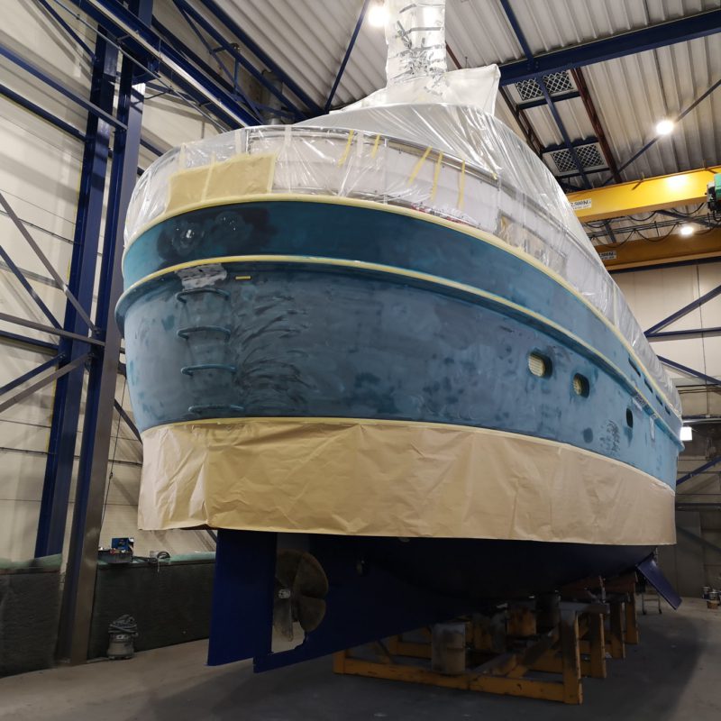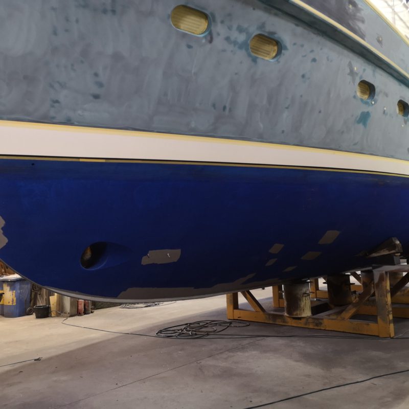 Dit prachtige motorjacht was aangevaren en had daardoor schade opgelopen. Wij hebben de schadeplekken hersteld door middel van schuren en plamuren. Daarna zijn de plekken voorbehandeld met primers zodat het verfsysteem weer opgebouwd is. Vervolgens is de gehele romp geschuurd en afgespoten in de Awlgrip Topcoat, kleur Majestic Blue. Deze klus is uitgevoerd met jachtschilder René Hoekstra. Tegelijkertijd konden wij het onderwaterschip ook onder handen nemen en is er een nieuwe laag antifouling aangebracht. Is het geen schitterend plaatje geworden?
