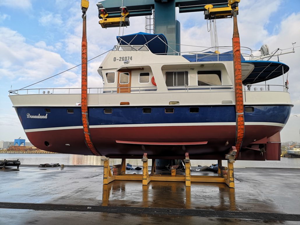 Van het motorschip Donauland is het onderwaterschip gestraald en daarna is er een compleet nieuw verfsysteem van Hempel aangebracht.