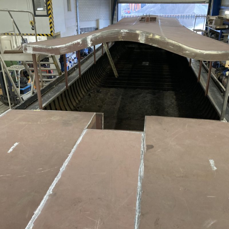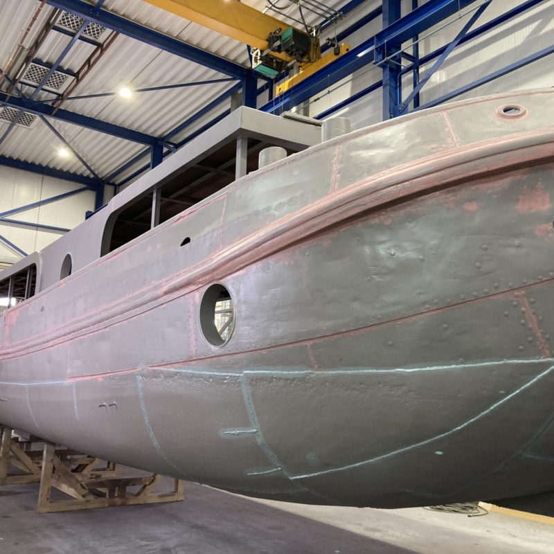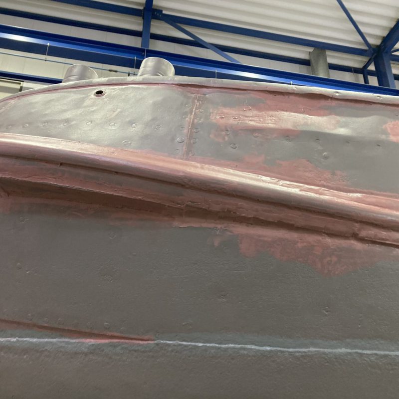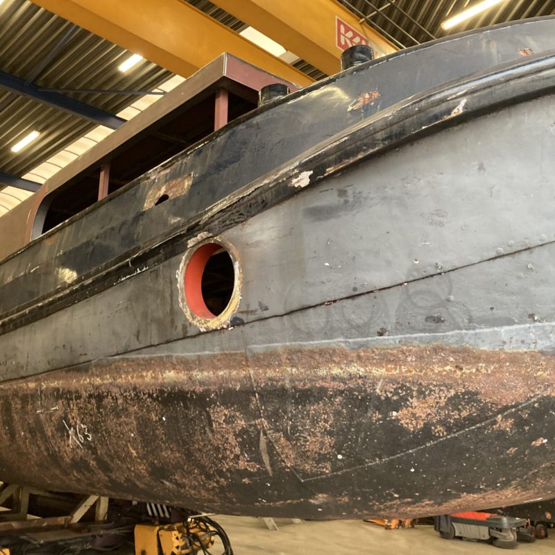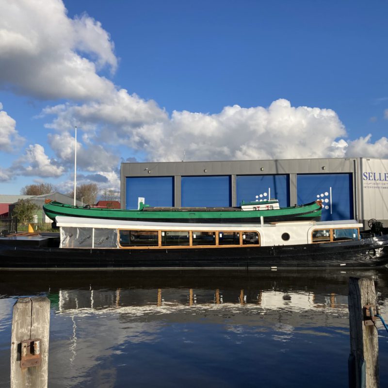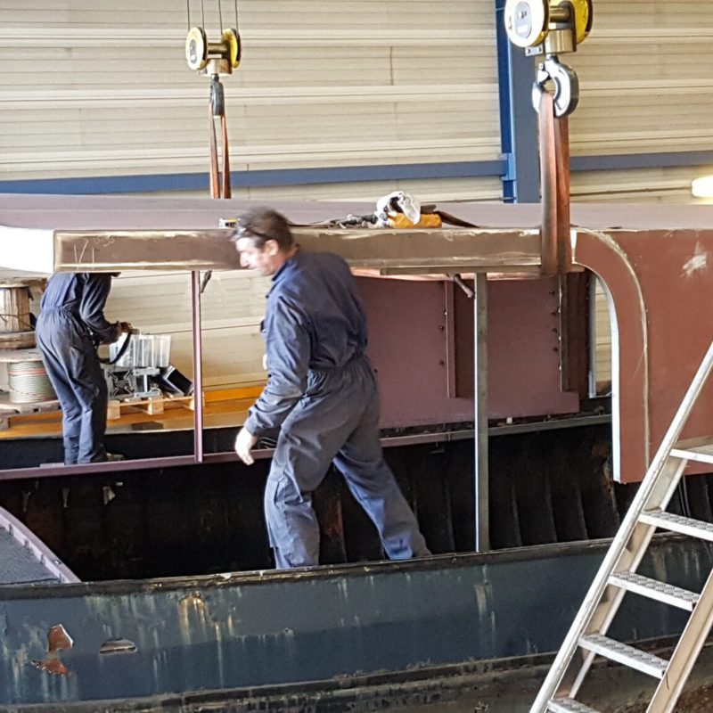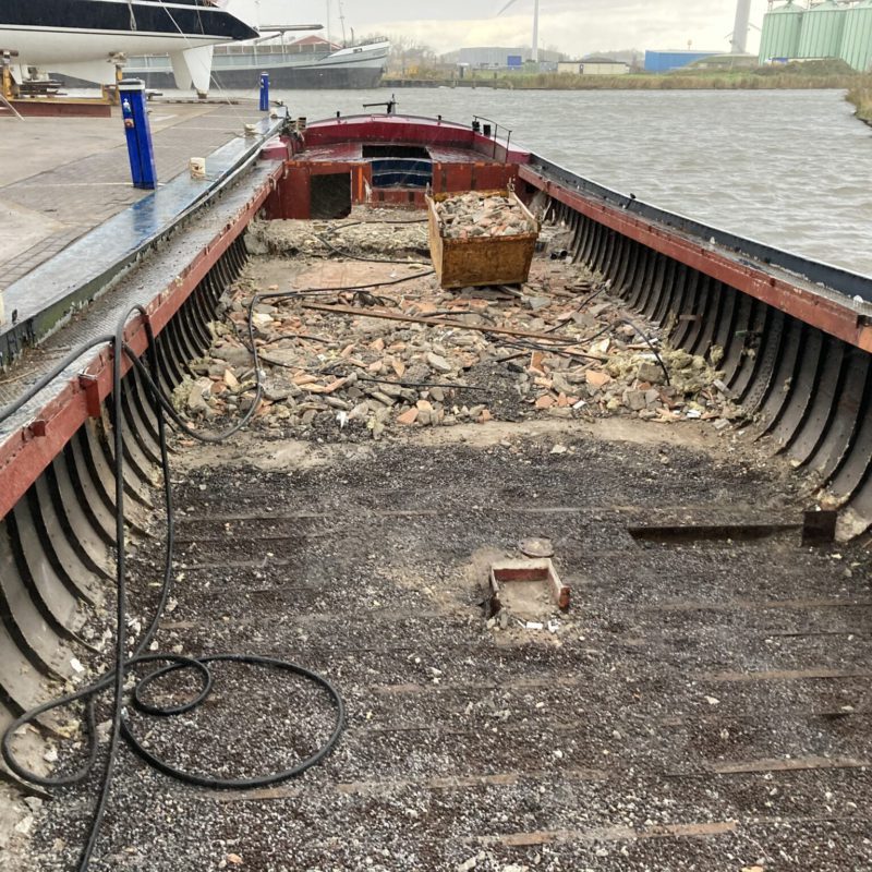 De afgelopen periode hebben wij een grote refit van het woonschip Trinity uitgevoerd. Eerst hebben we het polyester dak met hout, kozijnen met glas, betimmering, natuurstenen badkamer, technische installatie en betonnen vloer verwijderd. Daarna is er een nieuw stalen zadeldak gemaakt en geplaatst. Verder hebben wij de noodzakelijke staalreparaties uitgevoerd. Vervolgens hebben wij de gehele buitenzijde gestraald en voorzien van een Hempel verfsysteem in 4 lagen. Het dak en de romp is afgespoten in een Hempathane hoogglans aflak. De dekken zijn voorzien van een antislip conservering.