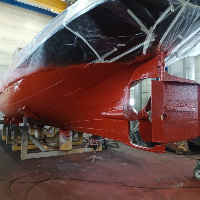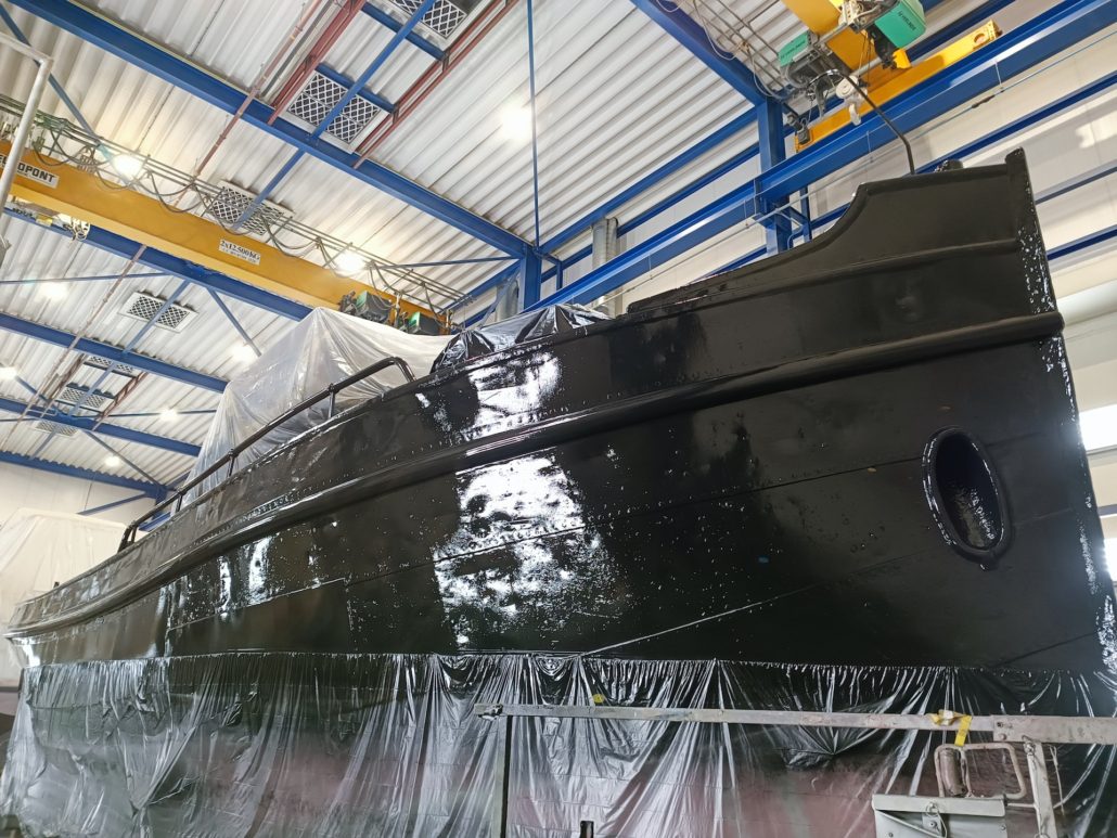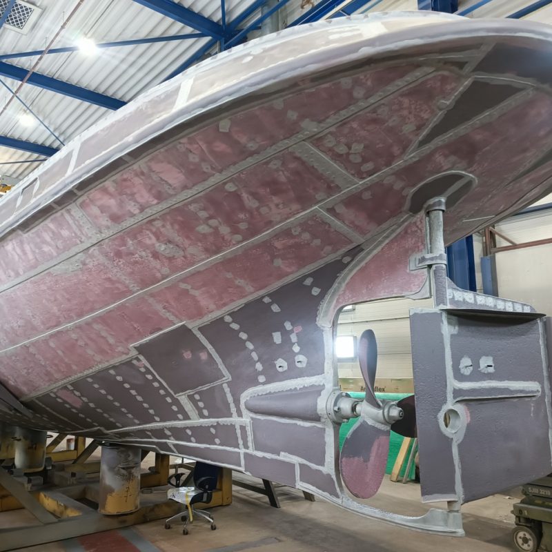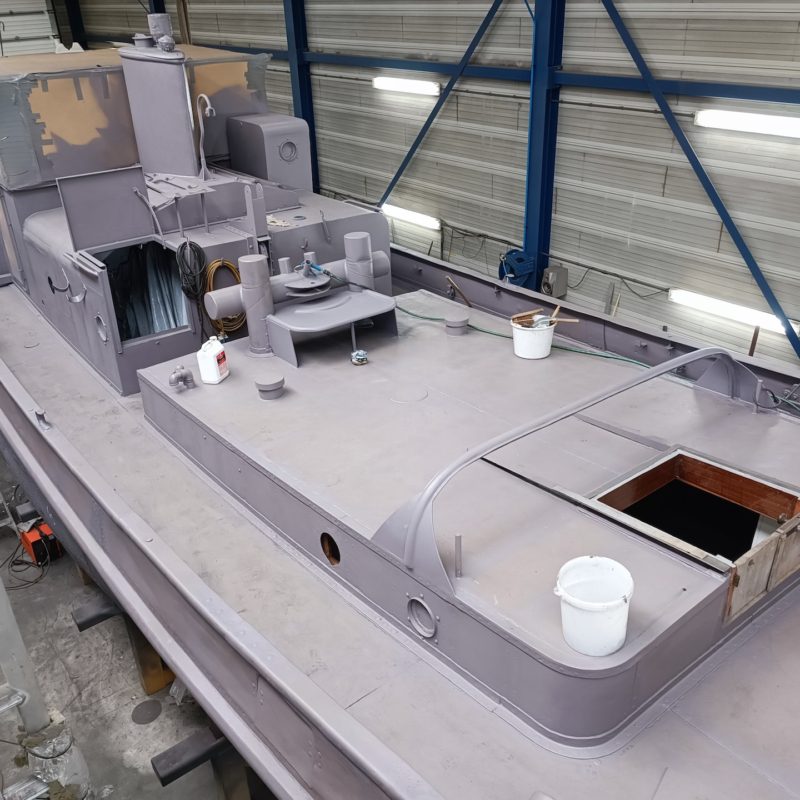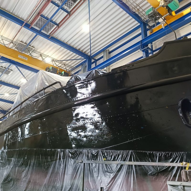 Na de constructieve werkzaamheden is de Tijma opnieuw gestraald volgens de SA2,5-norm en voorzien van een compleet verfsysteem van Hempel. Voor de bovenbouw is gekozen voor Nelfadur lakverf met een 2DN-topcoat, wat zorgt voor een duurzame en esthetisch aantrekkelijke afwerking. Onder de waterlijn is het schip behandeld met een antifouling-coating, om aangroei te voorkomen en de prestaties in het water te optimaliseren.
