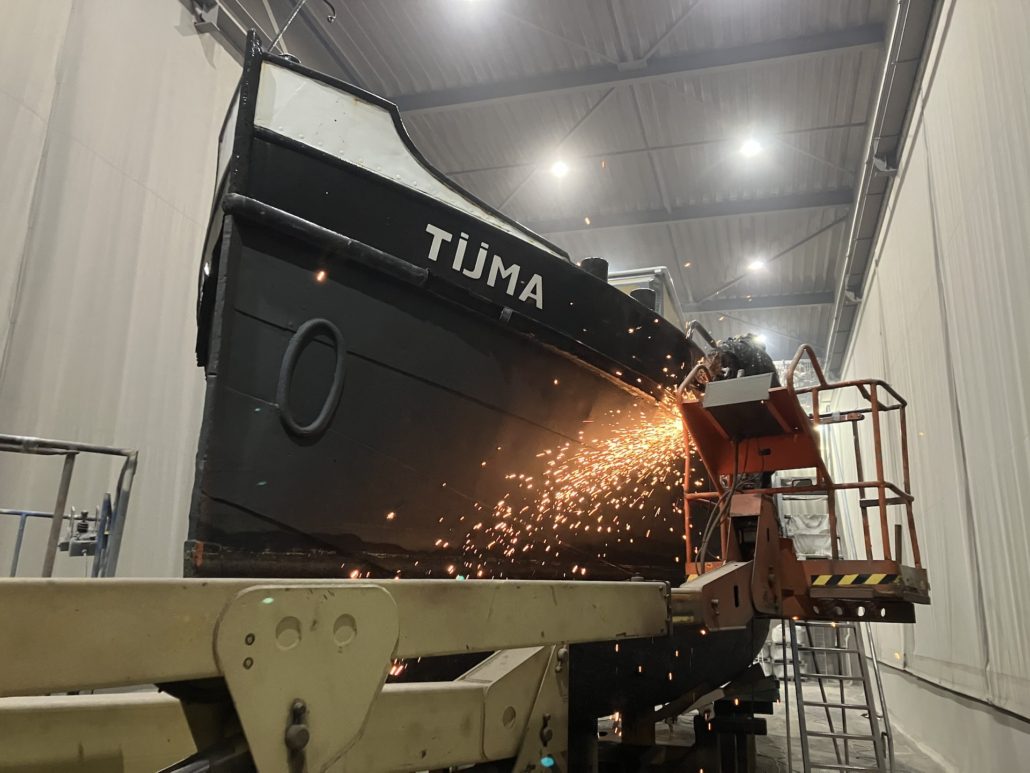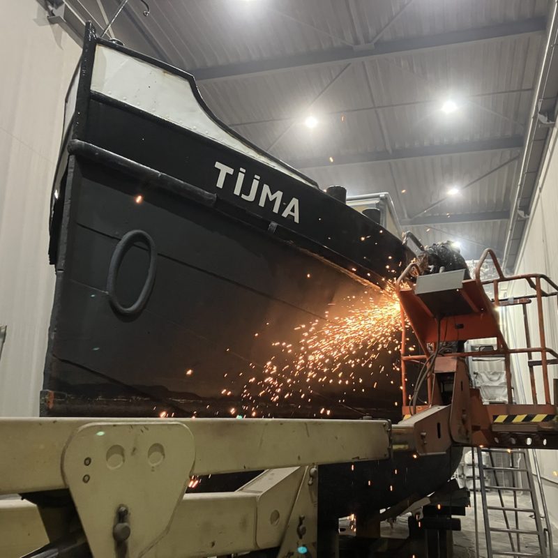 Na een grondige inspectie van het ijzerwerk, is de Tijma volledig gestraald om oude verflagen en roest te verwijderen. Vervolgens zijn noodzakelijke reparaties uitgevoerd aan het potdek, waarbij kitresten zorgvuldig zijn verwijderd. Op plekken waar het staal verzwakt was, is het vlak verdubbeld en waar nodig zijn klinknagels opnieuw opgelast. Dit zorgt ervoor dat het schip weer optimaal bestand is tegen de elementen en zware omstandigheden op het water.