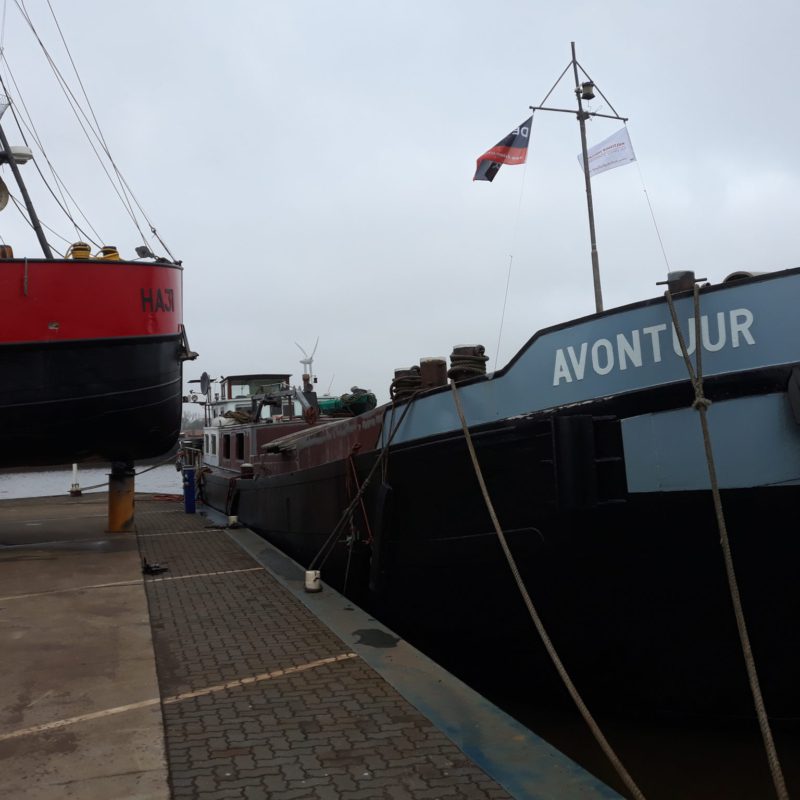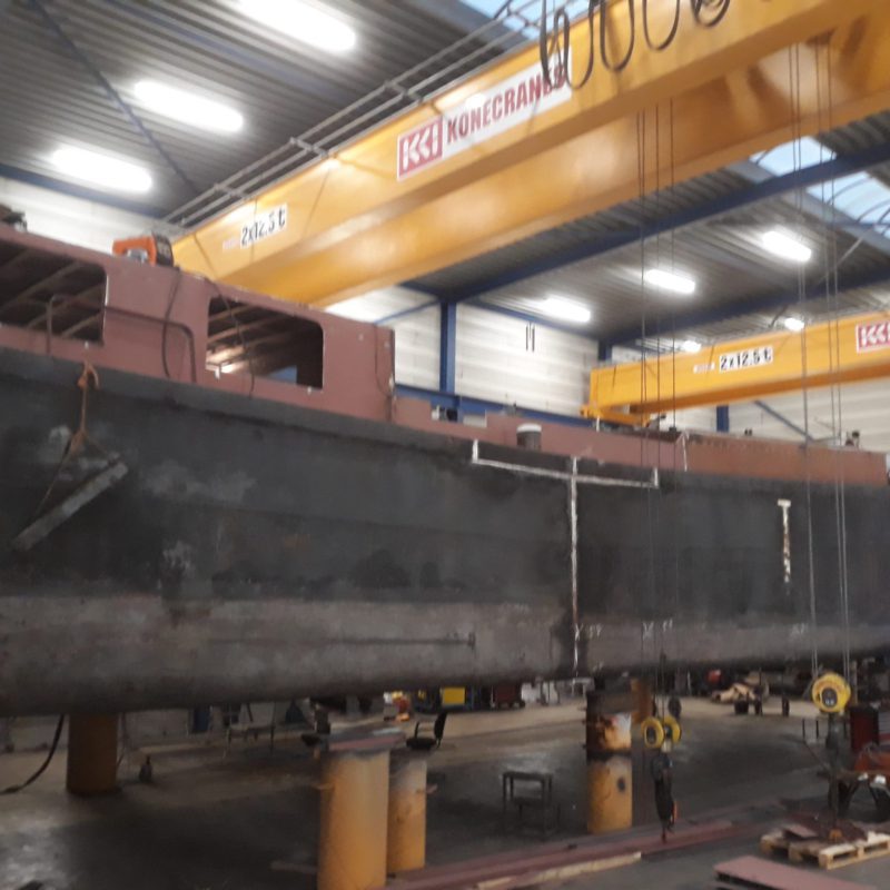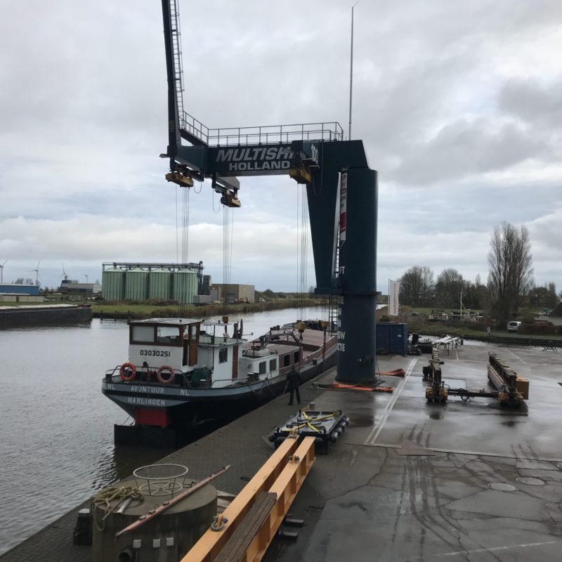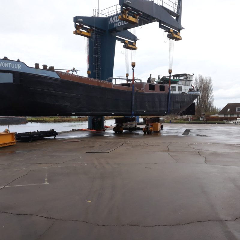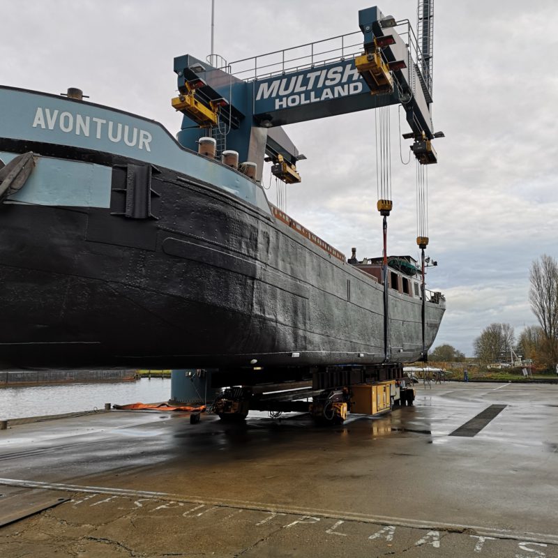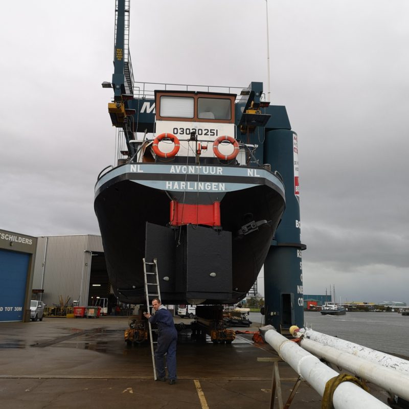 Het motortankschip Avontuur is bij ons op de werf omgebouwd naar een woonschip. Eerst zijn de twee stalen tanken met een gewicht van 18.000 kg verwijderd. Daarna is het schip in het water doormidden gesneden en zijn beide helften uit het water getild. Het schip is 20 meter(!) ingekort en er is een nieuwe kap en roef op gemaakt. Het onderwaterschip en de romp zijn gespoten in een 2-laags Hempel systeem. het schip gaat een mooi tweede leven tegemoet in Engeland.