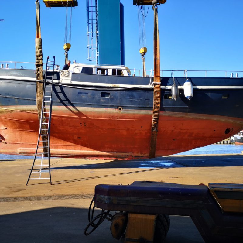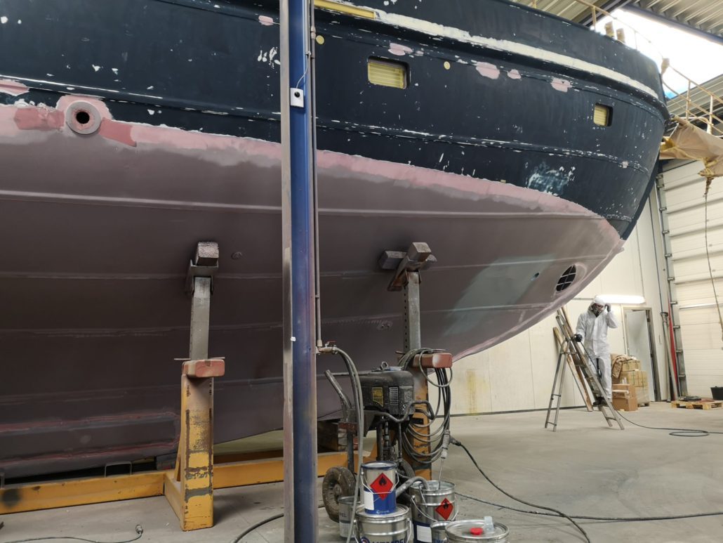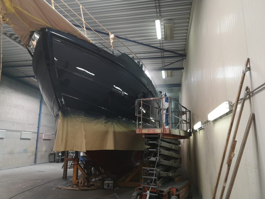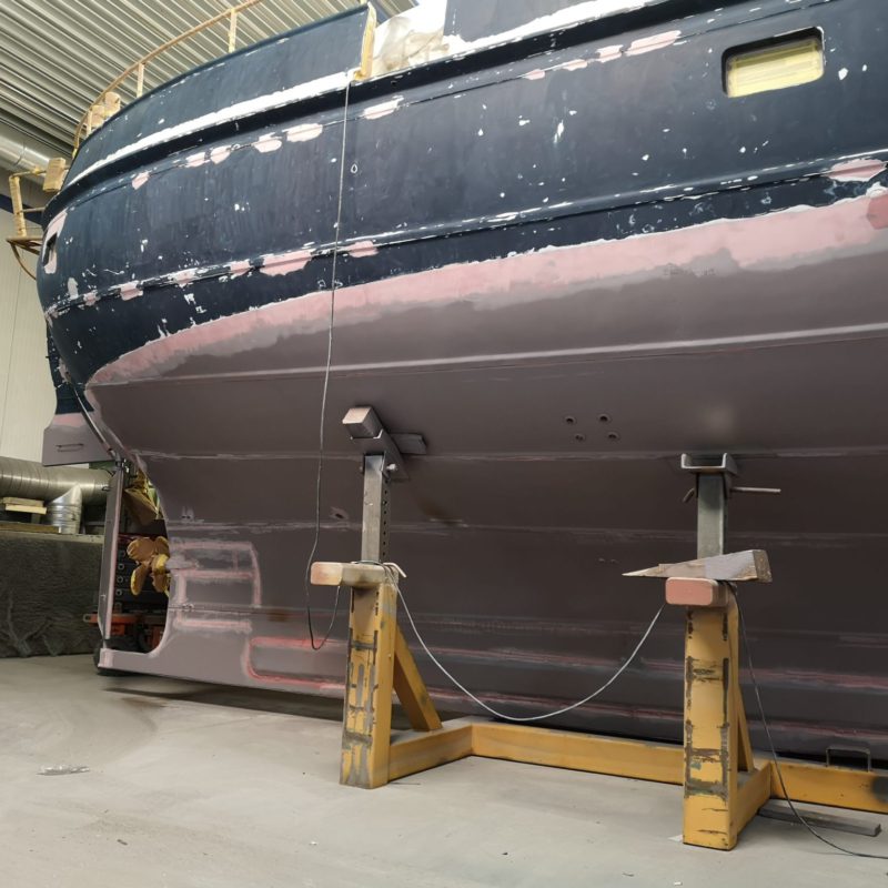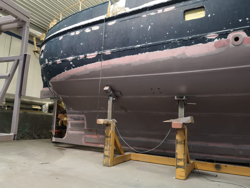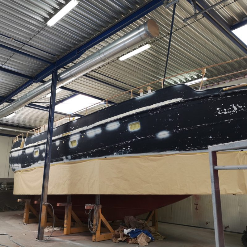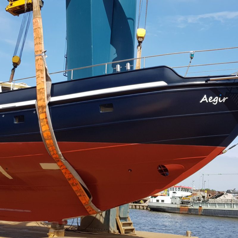 Dit prachtige zeiljacht Aegir (type Colin Archer) was bij ons op de werf voor een onderhoudsbeurt. Nadat we het onderschip geheel hebben gestraald, en na de noodzakelijke reparaties, is er een 5 lagen twee-componenten verfsysteem van Hempel aangebracht. De waterlijn is netjes afgewerkt met plamuur, net als de lasnaden.