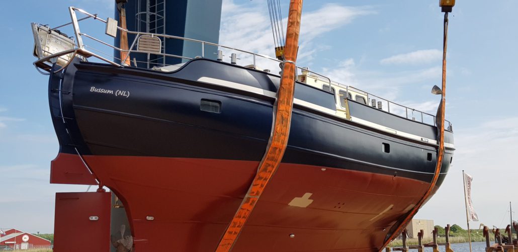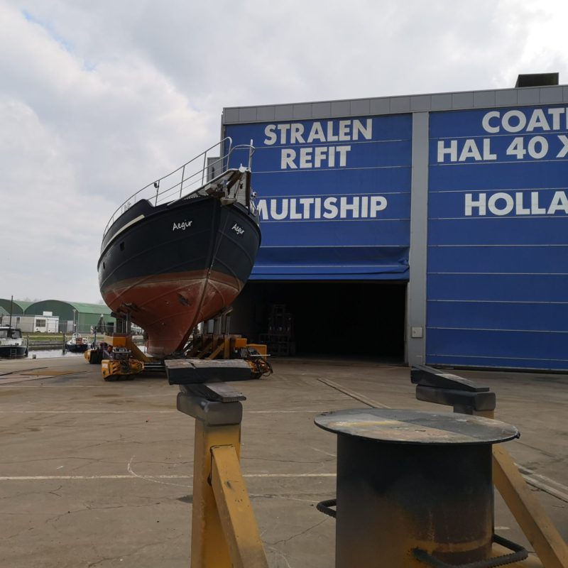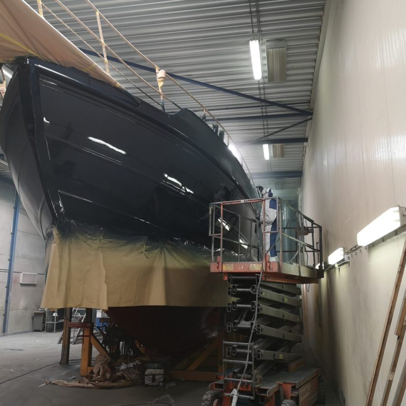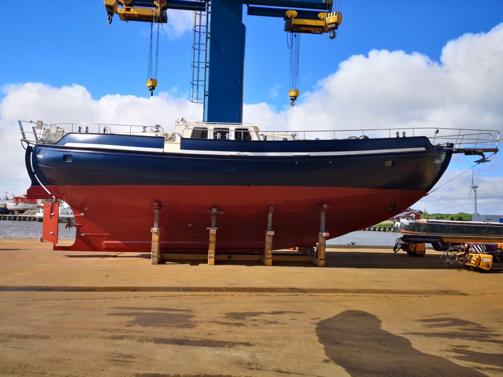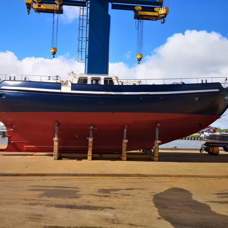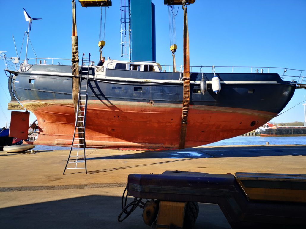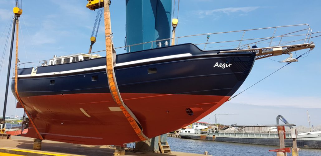 Dit prachtige zeiljacht Aegir (type Colin Archer) was bij ons op de werf voor een onderhoudsbeurt. Nadat we het onderschip geheel hebben gestraald, en na de noodzakelijke reparaties, is er een 5 lagen twee-componenten verfsysteem van Hempel aangebracht. De waterlijn is netjes afgewerkt met plamuur, net als de lasnaden.