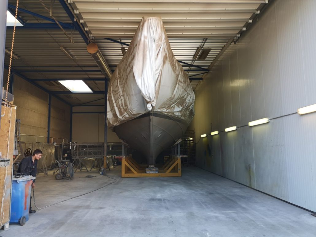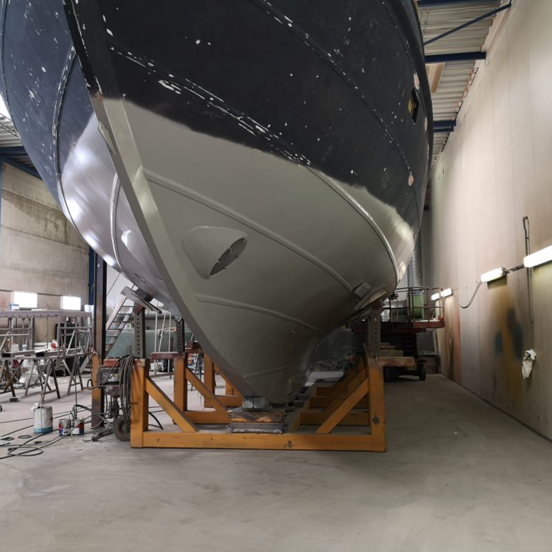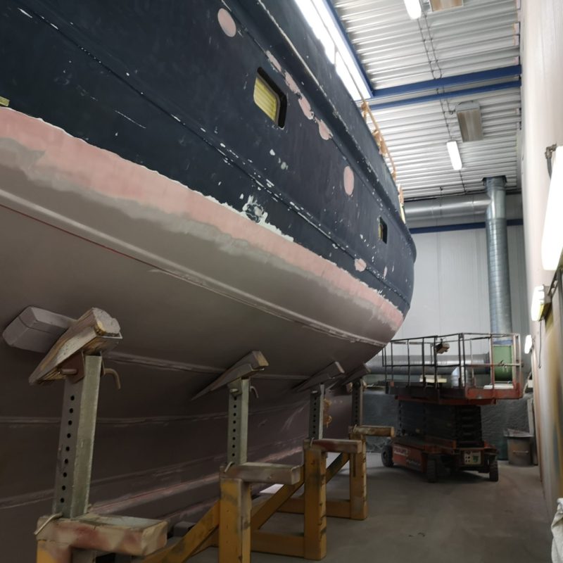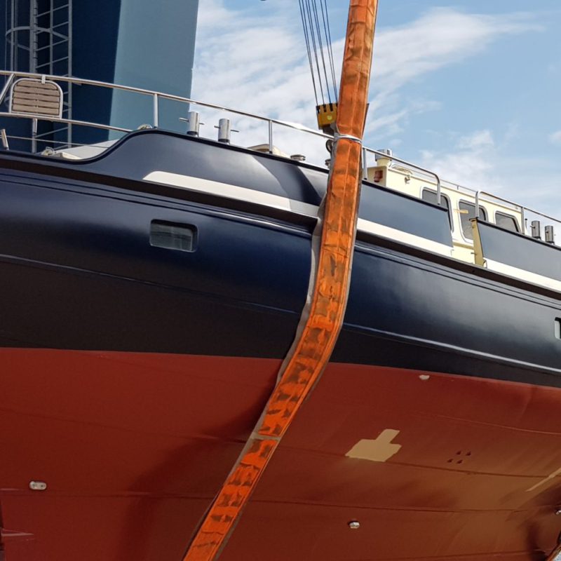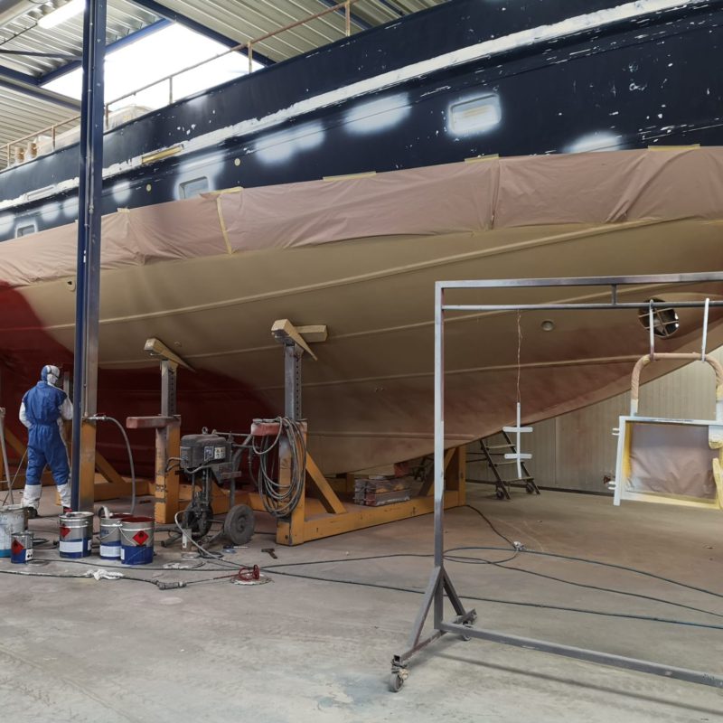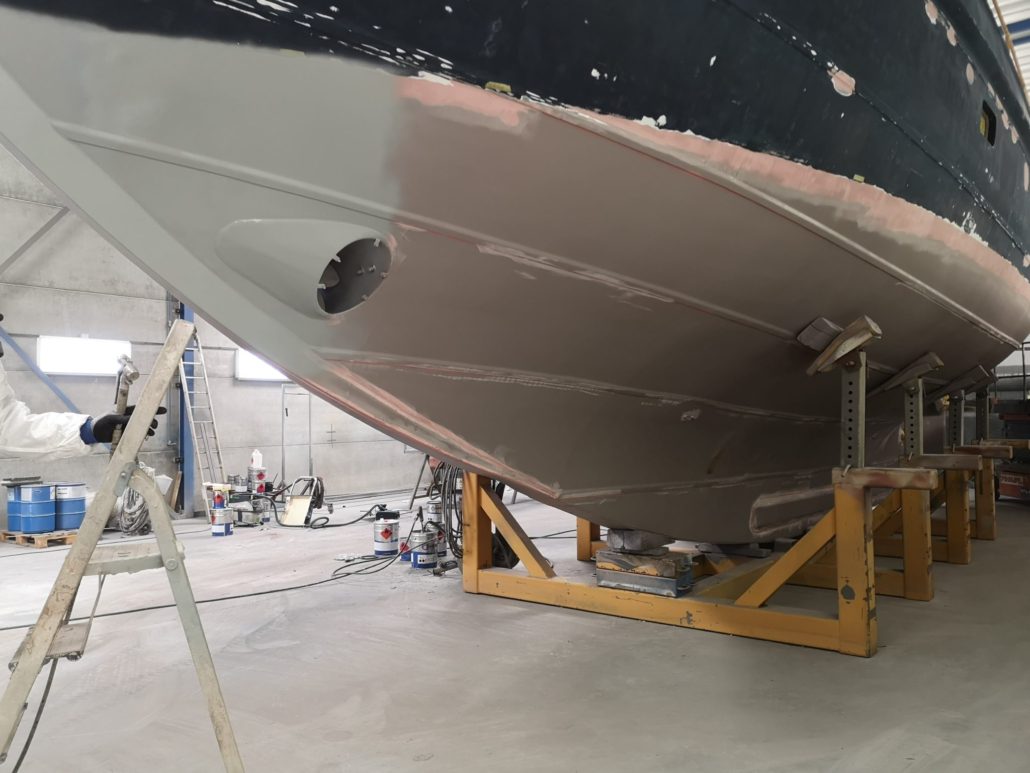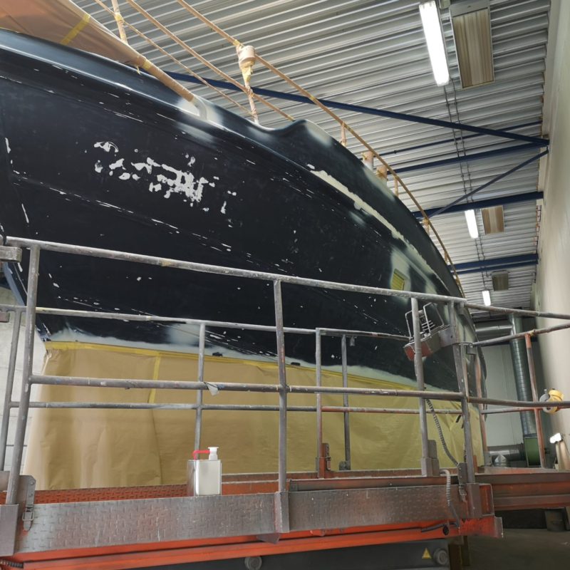 Dit prachtige zeiljacht Aegir (type Colin Archer) was bij ons op de werf voor een onderhoudsbeurt. Nadat we het onderschip geheel hebben gestraald, en na de noodzakelijke reparaties, is er een 5 lagen twee-componenten verfsysteem van Hempel aangebracht. De waterlijn is netjes afgewerkt met plamuur, net als de lasnaden.