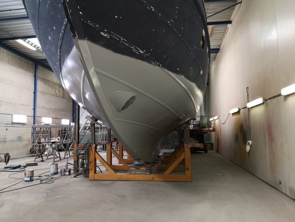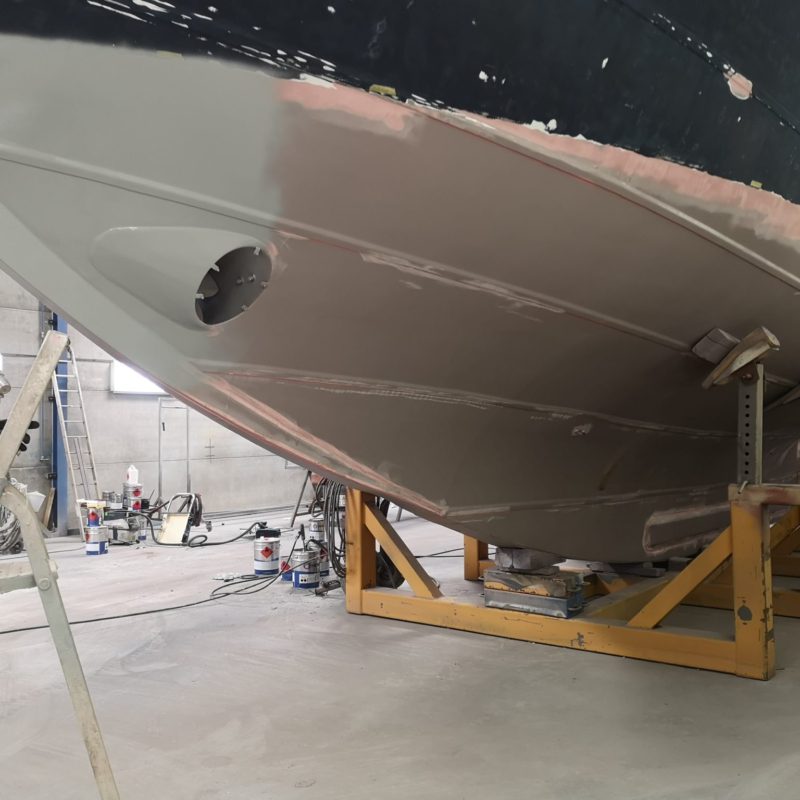 Ook de romp is onder handen genomen. Beschadigingen zijn plaatselijk gestraald, voorzien van primers en geplamuurd. Daarna is de gehele romp weer geschuurd en vervolgens 2 x afgespoten in een Nelf coating (Nelfadur ZG topcoat).