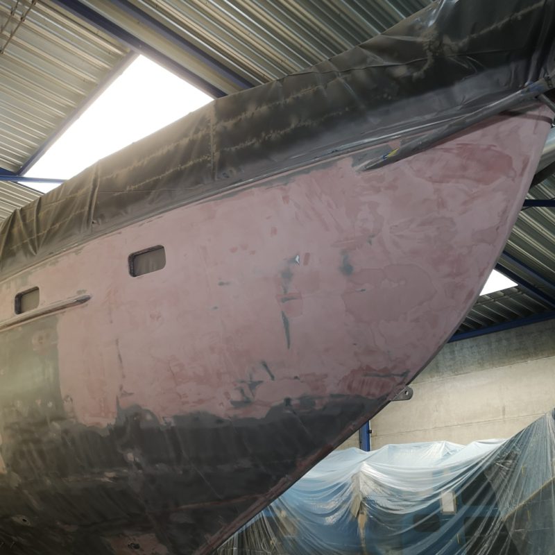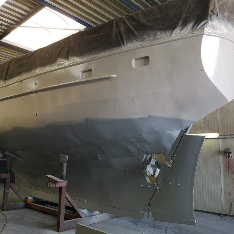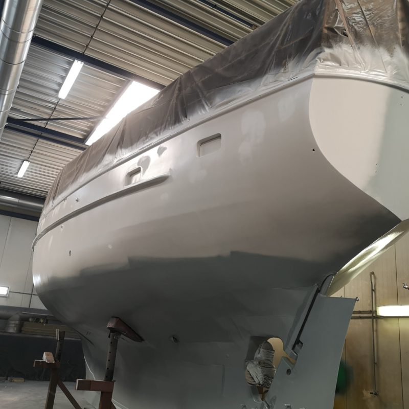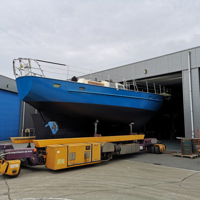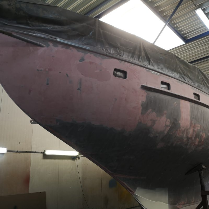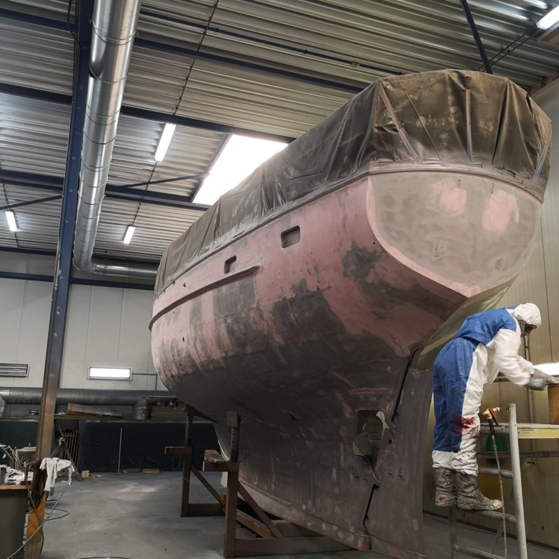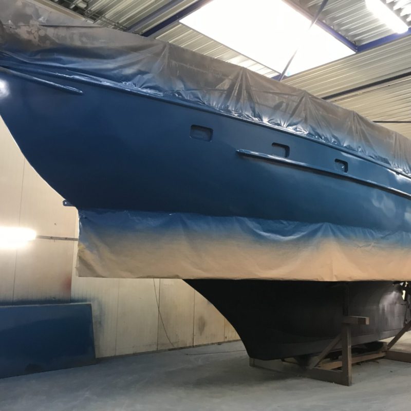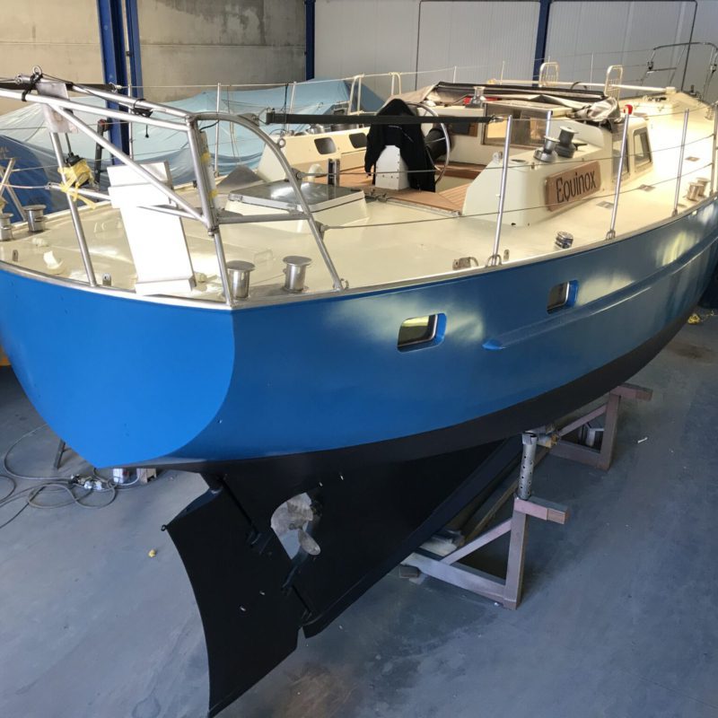 Het zeiljacht Equinox is door ons van ’top tot kiel’ in een nieuwe look gezet! Eerst hebben we een paar kleine reparaties uitgevoerd. Daarna is het onderwaterschip en de romp volledig gestraald. Na de eerste laag primer (Hempadur Mio 1557) is er plamuur aangebracht om de grootste oneffenheden weg te halen. Na het nodige schuurwerk is de romp vervolgens opgebouwd met 2 lagen Hempadur 45143 epoxyprimer. Als aflak is de Nelfadur topfinish zijdeglans lakverf in de kleur Azuurblauw aangebracht. Vervolgens is het onderwaterschip voorzien van een 4-laags verfsysteem met als afsluiter zwarte antifouling.