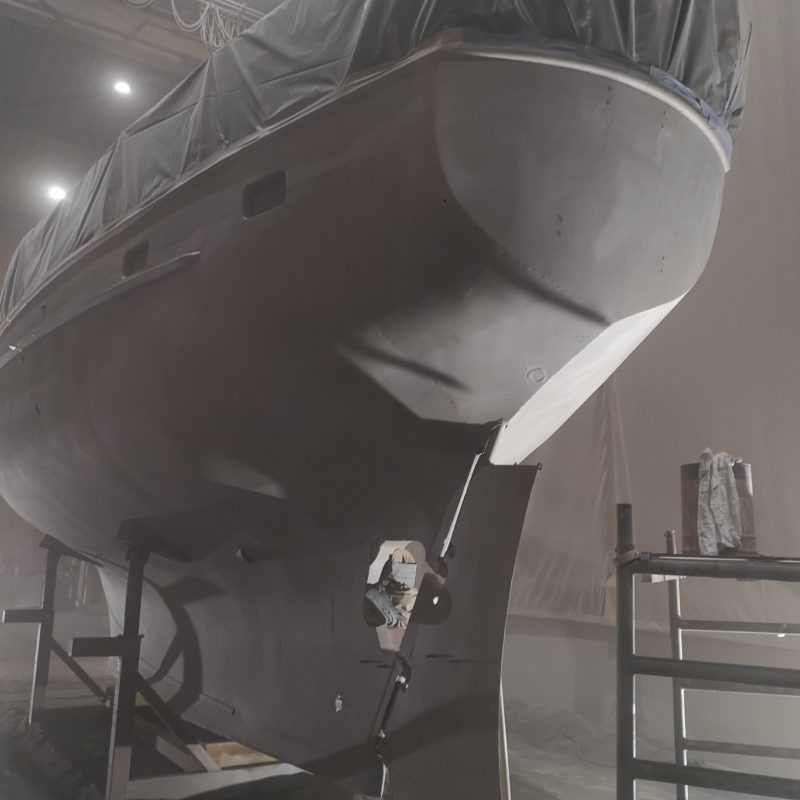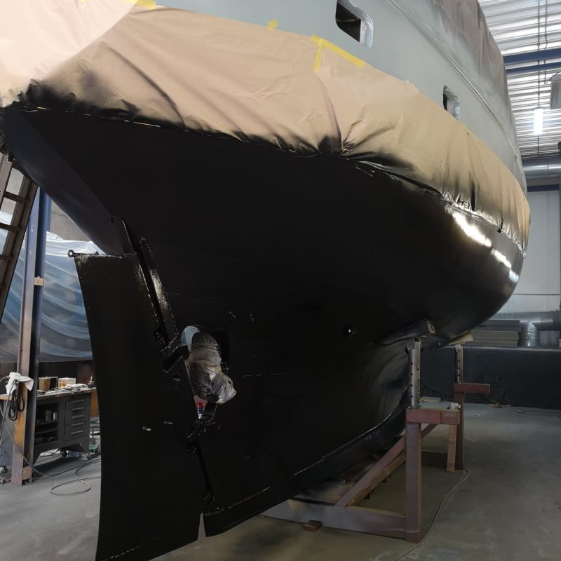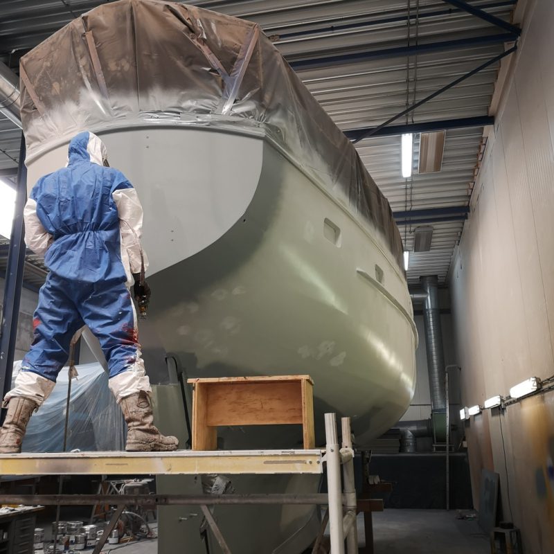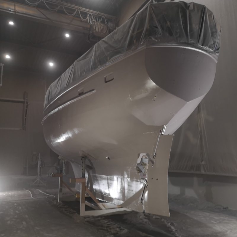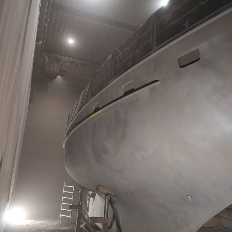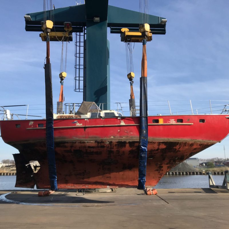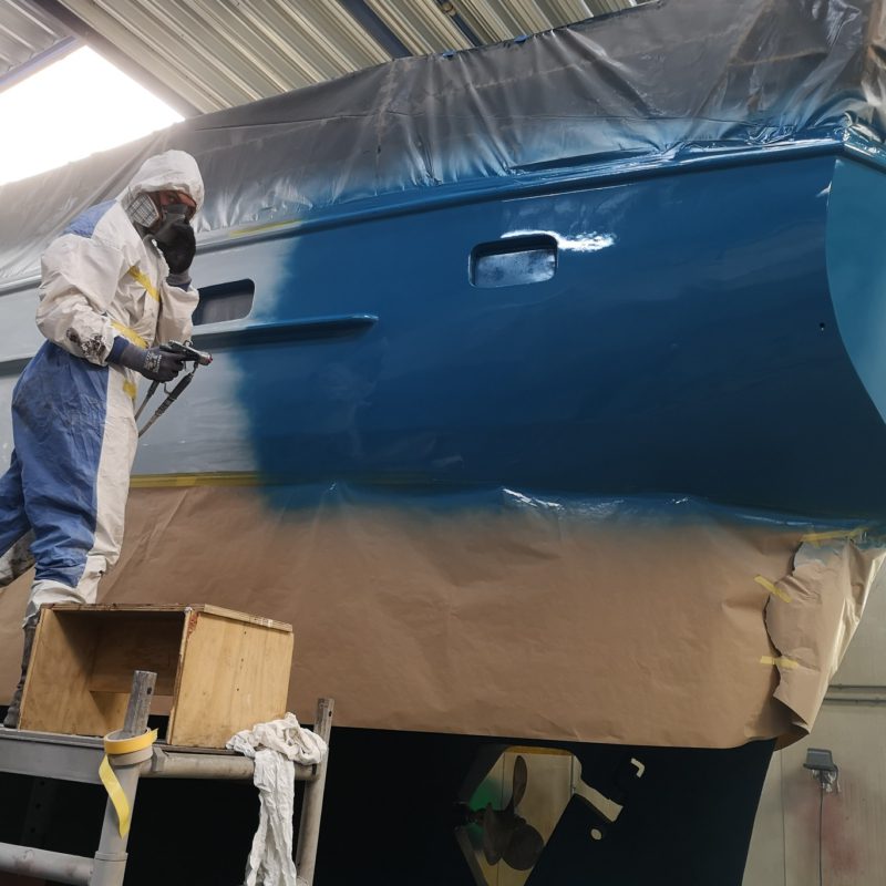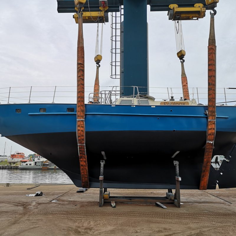 Het zeiljacht Equinox is door ons van ’top tot kiel’ in een nieuwe look gezet! Eerst hebben we een paar kleine reparaties uitgevoerd. Daarna is het onderwaterschip en de romp volledig gestraald. Na de eerste laag primer (Hempadur Mio 1557) is er plamuur aangebracht om de grootste oneffenheden weg te halen. Na het nodige schuurwerk is de romp vervolgens opgebouwd met 2 lagen Hempadur 45143 epoxyprimer. Als aflak is de Nelfadur topfinish zijdeglans lakverf in de kleur Azuurblauw aangebracht. Vervolgens is het onderwaterschip voorzien van een 4-laags verfsysteem met als afsluiter zwarte antifouling.